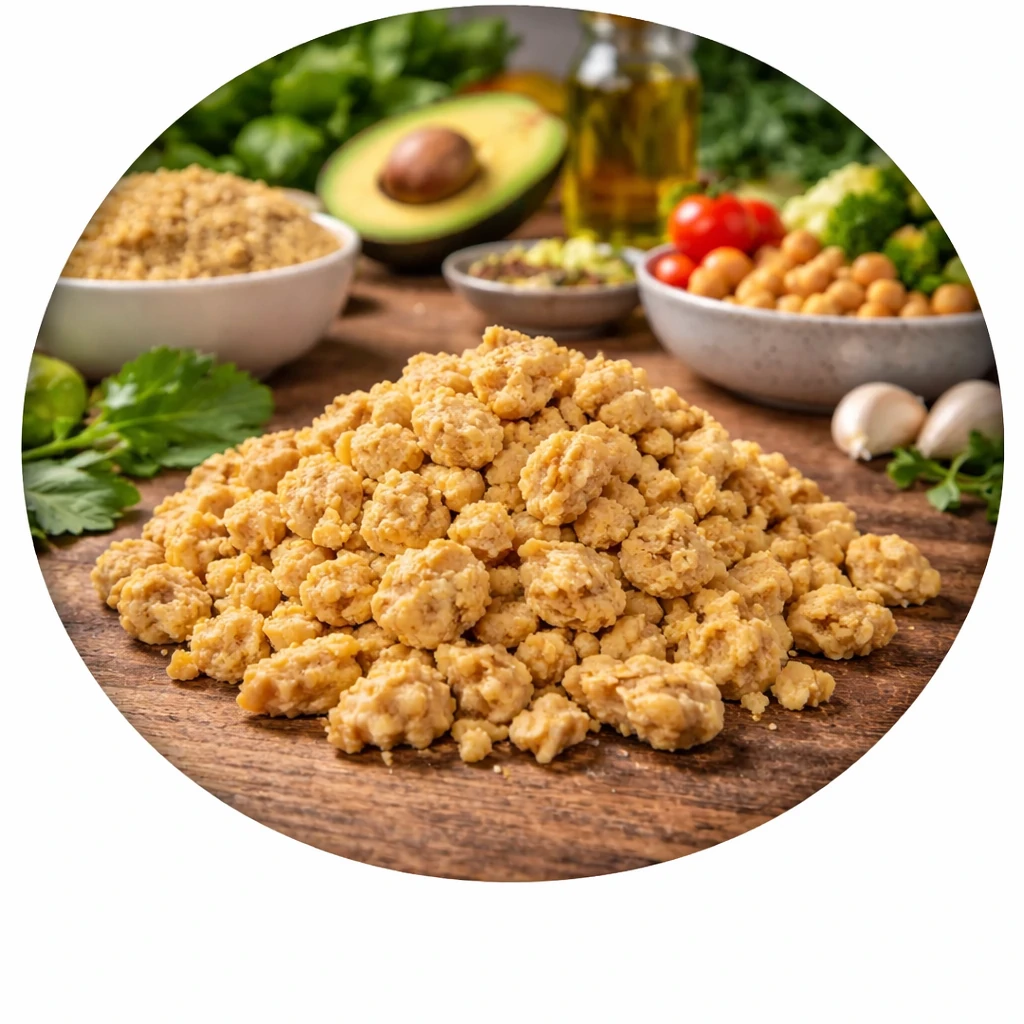 - Ingrediënten: Geïsoleerde soja-eiwitten, Tarwe-eiwitten 15%,Tarwezetmeel 3%, Sojaolie